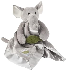 - Plush, beautifully detailed gray lovie with elephant's head and trunk, front legs holding a sound-making, green crinkle leaf and tail on the back